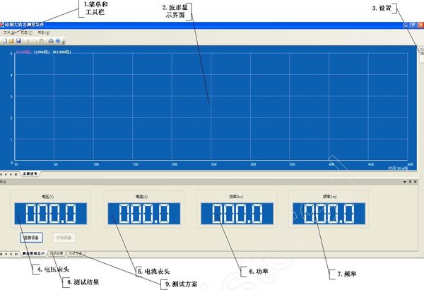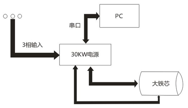 测试装置采用大功率输出(最大输出功率30kw,最大输出电流300A)电源对铁芯在工频条件下空载电流和铁芯损耗(初级)进行测量,通过 PC上软件对电源进行控制和读取, PC软件具有自动测量、测试数据实时显示、测试结果保存、测试方案保存等功能。